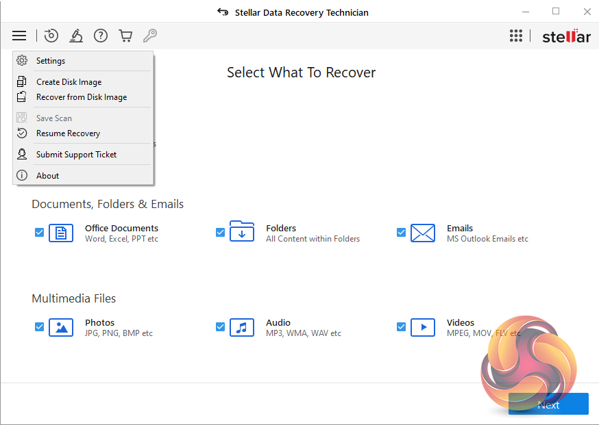 With this dropdown menu, you can access Settings (configure general, file types and recovery settings), Create a Disc Image, Save Scan (save scan information for resuming recovery at a later stage) Resume Recovery (resume recovery by using a scan information file), Submit Support Ticket and in the About option there is a link to the Help webpage.