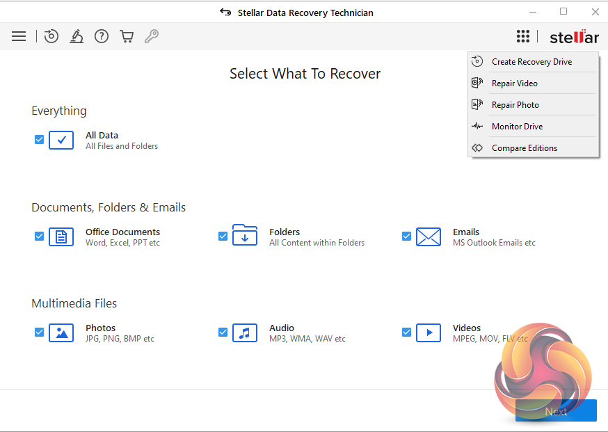 This menu provides links to other tools. You can create a recovery drive, repair videos and photos, monitor a drive and compare various versions of Stellar's data recovery software.