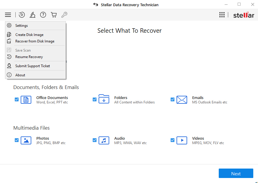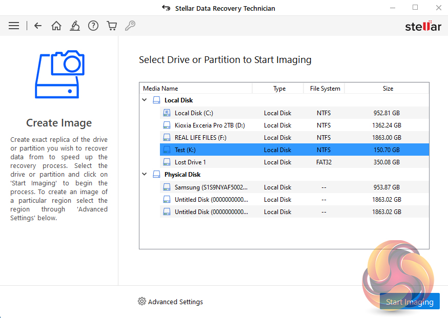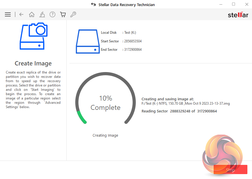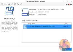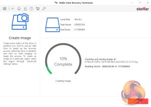 Stellar's Data Recovery Technician supports the creation of disk images, saving them as .IMG files. It supports imaging of hard disks, logical volumes on disks, USB drives and external hard drives. As with most actions when you use Stellar Data Recovery Technician you start from the dashboard but this time not via an icon. With the Technician version of the software, the Create Disk Image link is in the drop-down menu accessed via the “hamburger” shortcut. The software displays all the discs and partitions in the system. You then select which one you want to image, in this case, it was a 150GB partition. Clicking on the Start Imaging button starts the process.