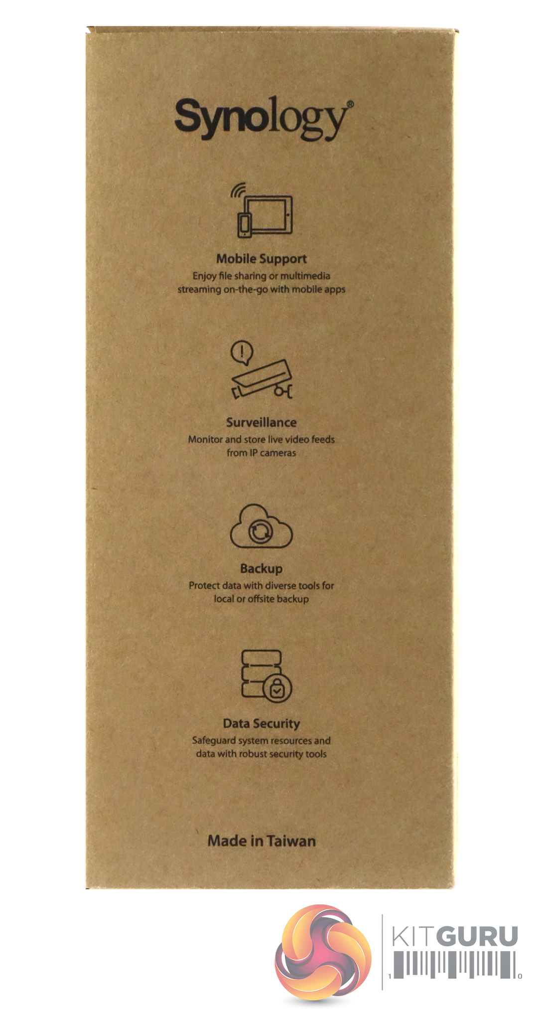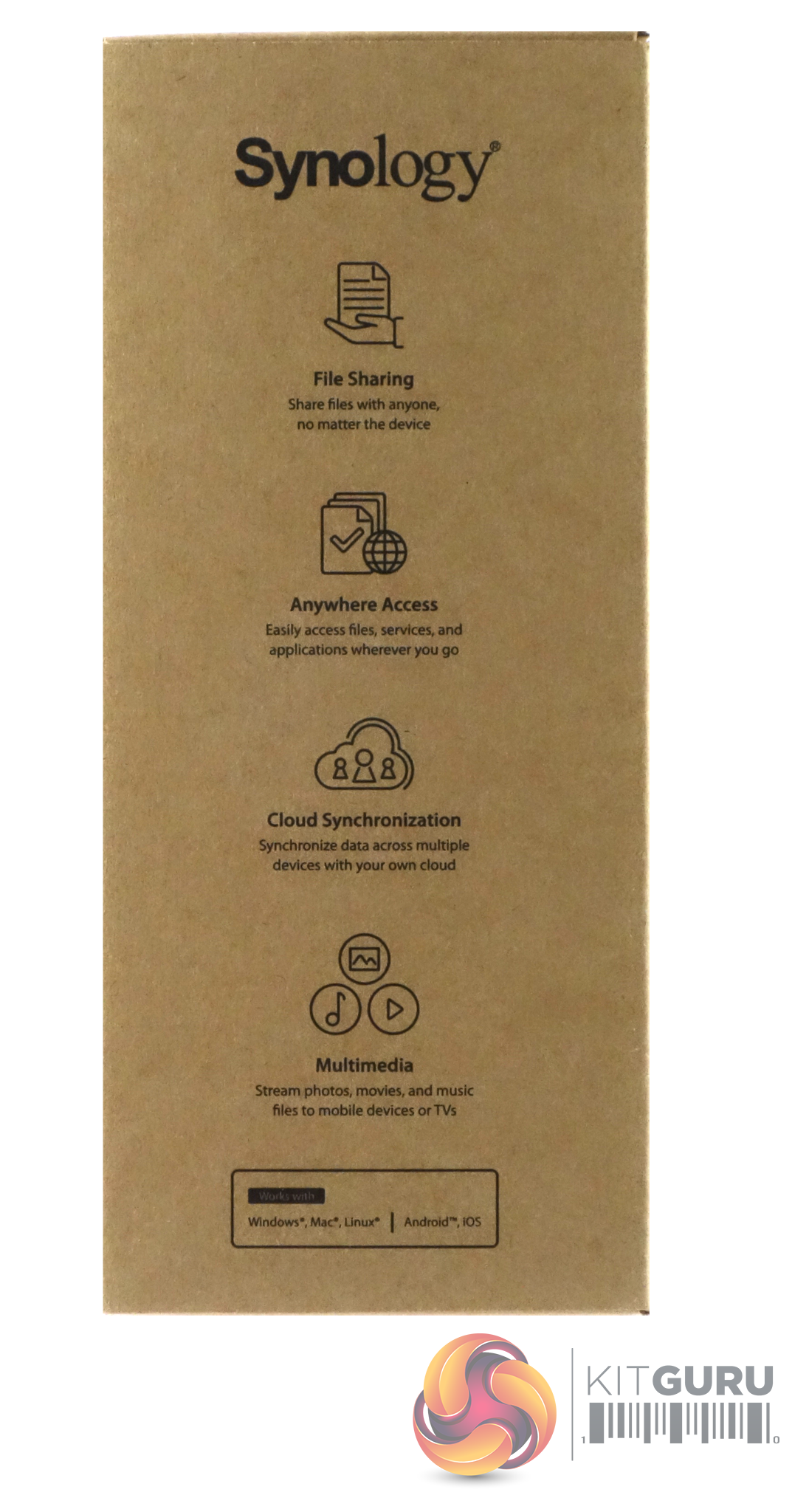 One side of the box has a group of icons representing some of the DSM OS features; File Sharing, Anywhere Access, Cloud Synchronization and Multimedia. Under these is a small panel listing what OS the NAS is compatible with; Windows. Mac, Linux, iOS and Android. The other side panel has a list of possible uses for the DS119j; Mobile Support, Surveillance, Backup and Data Security.