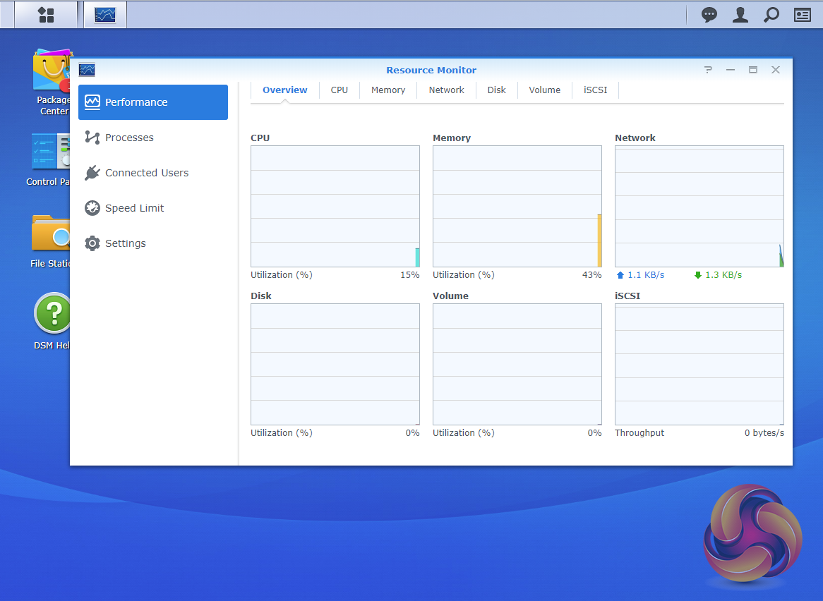 The Resource Monitor is an easy to use tool to keep an eye on the DiskStation’s resources. With it you can monitor CPU usage, memory usage, disk utilisation and network flow in real time or historically.