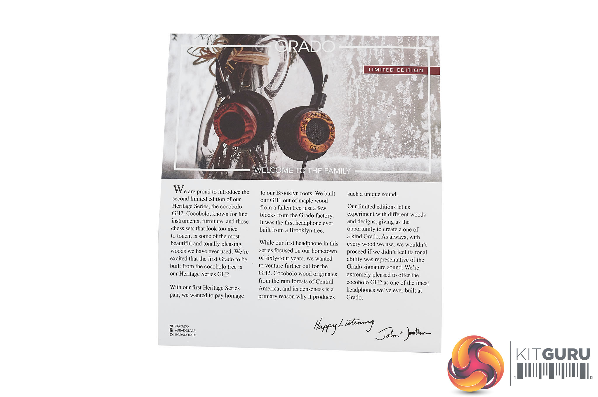 Inside the box is a pull out sheet of paper explaining the family heritage and that this headphone is actually the second limited edition of the Heritage Series. This headphone is crafted from Cocobolo wood which is known for use in the construction of instruments. Grado say that Cobobolo wood is ‘some of the most beautiful and tonally pleasing woods we have ever used'. Grado fans will already know that the GH1 headphone run was crafted from a fallen Maple tree in their home city of Brooklyn. It is no longer available.