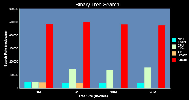 “Data structures such as binary trees are common in the programming world. Parsing such trees is an operation employed by many algorithms and while the CPU can perform this task the GPU is much more efficient due to the parallel operations involved. Prior to HSA, applications would have to copy the (flattened) tree onto GPU-accessible memory to benefit from such accelerated computing, while in the case of HSA the GPU inside Kaveri can directly access this memory through hUMA (heterogeneous Unified Memory Architecture)”, said Nic.
