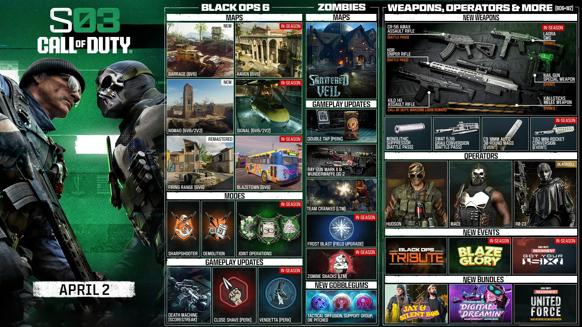 Season 3 of Call of Duty Black Ops 6 is almost upon us. Following a slight delay, the upcoming update is set to go live on the 2nd of April. Ahead of this, Activision/Treyarch have shared a full roadmap for everything we can expect to be added – including half a dozen maps; new perks; modes; scorestreaks; weapons and much more.