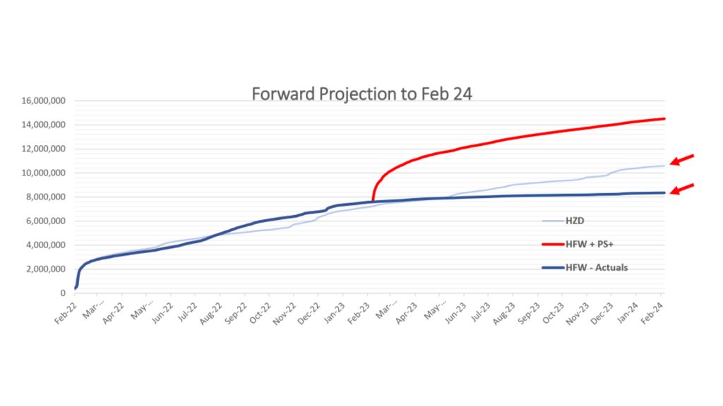 “It is very clear that inclusion into PS+ has had a big effect on traditional sales. The below graph shows the Daily Game Activations for HZD and HFW. In Year 1, HZD and HFW were very comparable. HFW was included into PS+ at the start of Year 2. HFW saw an enormous influx of PS+ players, but at the cost of flat-lining the Game Activations from Retail Sales.”