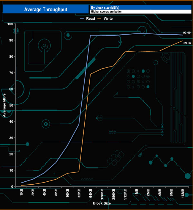 In our throughput tests, the peak read figure of 93.92MB/s came at the 1MB block mark with the test run finishing with a result of 93.09MB/s, just shy of the official 100MB/s maximum. The peak write figure came at the end of the test, the 89.56MB/s result being very slightly better than the official 85MB/s for writes.
